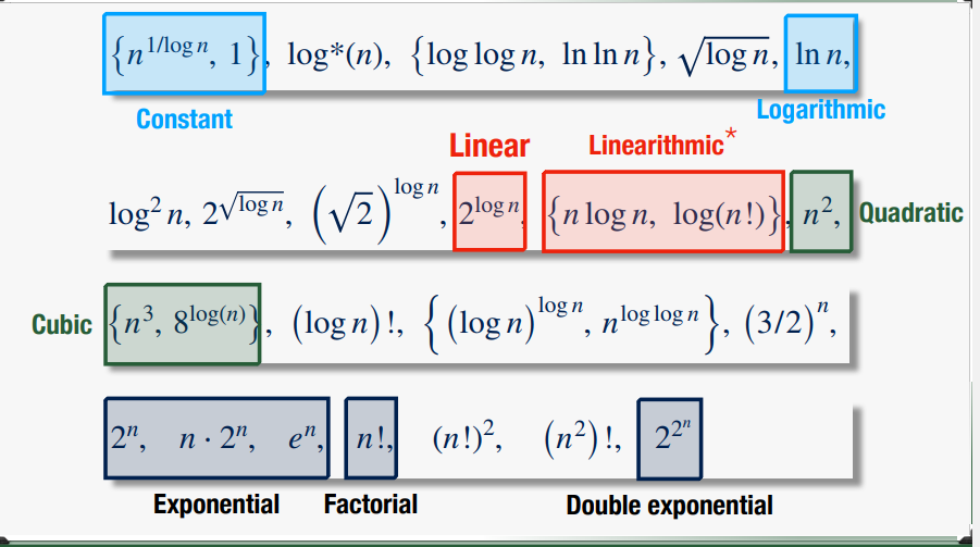 Big O \(h(n) \in O(f(n)) \iff \exists c, n_0\) such that \(\forall n \geq n_0, h(n) \leq cf(n)\)