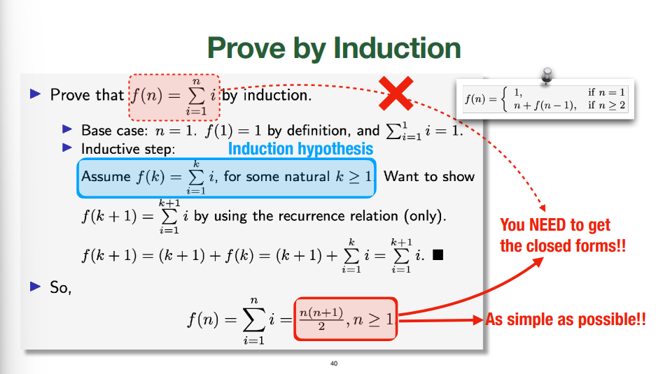 - Iterated sub: We keep relacing the recursive term of the equation with its definition until it forms a pattern