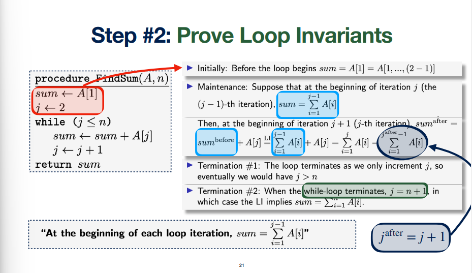 - Loop invariant: assertion that is true before loop (initialization), during the loop (maintenance), after the loop (termination 2) which has to stop (termination 1)