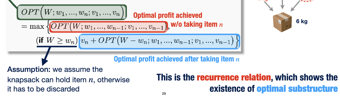 - Integral knapsack recurrence: \(OPT(W; w_1 \dots w_n; v_1 \dots v_n) = \max{\set{OPT(W; w_1 \dots w_{n-1}; v_1 \dots v_{n-1}), v_n + OPT(W - w_n; w_1 \dots w_{n-1}; v_1 \dots v_{n-1})}}\)