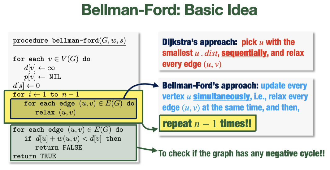 Slower than Dijkstra's algorithm, but can handle negative edge weights and is more flexible if the weight of an edge changes.