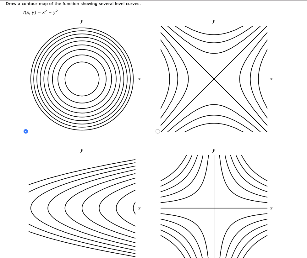 Note: implicit functions of \(x\) and \(y\) (e.g. \(x^2+y^2=r^2\)) can be seen as explicit functions mapping points in \(\mathbb{R}^2\) to some constant by using subtraction to move all the \(x\) and \(y\) terms to the left of the equation.